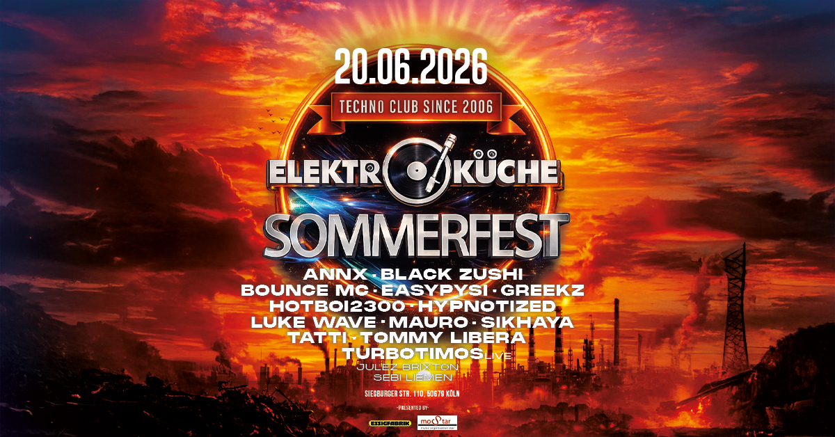 Markiert es fett im Kalender, denn am Samstag, den 20. Juni 2026, feiern wir das Sommerfest in der Elektroküche und verwandelt die Elektroküche, Essigfabrik und den Outdoor Bereich zu eurem persönlichen Spielplatz für einen Tag voller, Beats, Gute Laune und Momente die für ewig bleiben. Macht euch bereit für unendliche pure Energie und den besten Sound. Wir packen aus, was ihr hören wollt: Techno, Bounce, Hardtechno – von nachmittags bis tief in die Nacht.
